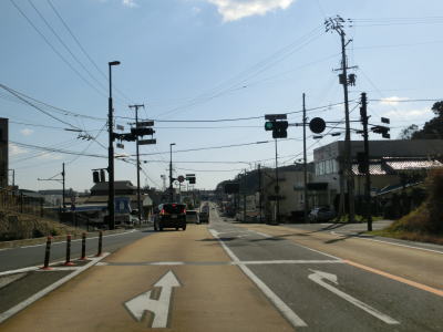 | 越路トンネル東交差点からは勾配を下るがすぐに平坦になる。新宮高校の南から右折車線が現れて約150m先でR42・R168橋本交差点に至る。かつては右折車線は1mたりとも存在しておらず渋滞しやすかったのだが、2016年に拡幅工事が行われて右折車線だけでなく歩道も設置されている。 | ||