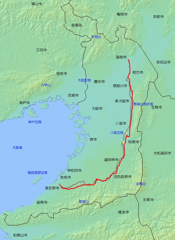 | 主な経由地 | 大阪府高槻市〜枚方市〜寝屋川市〜四條畷市〜大東市〜東大阪市〜八尾市〜柏原市〜藤井寺市〜羽曳野市〜富田林市〜河内長野市〜和泉市〜岸和田市〜貝塚市〜泉佐野市 |
