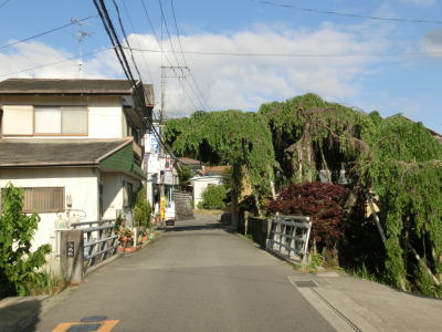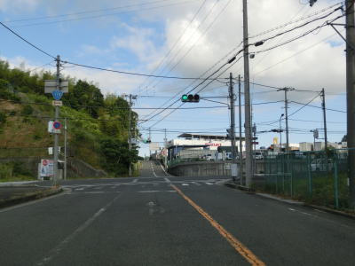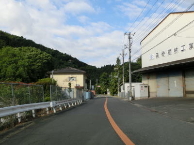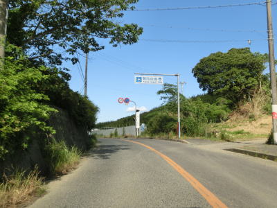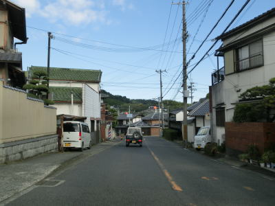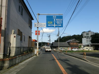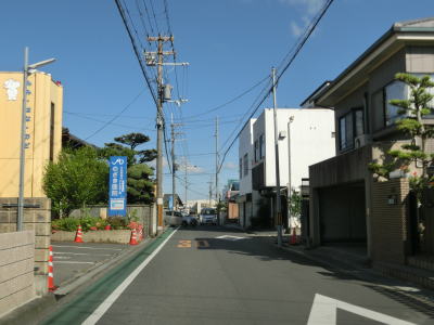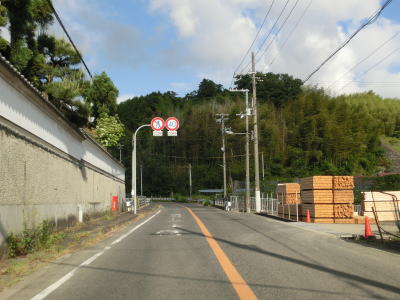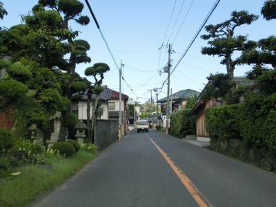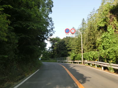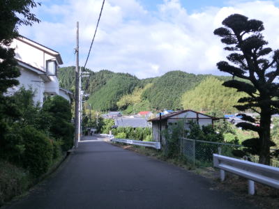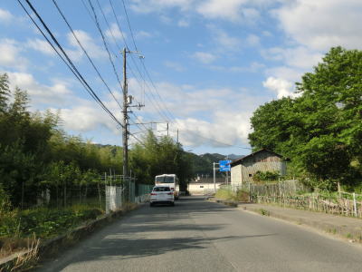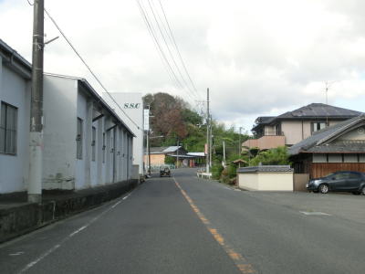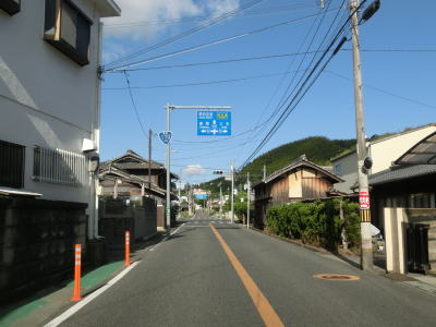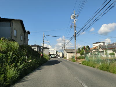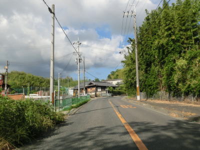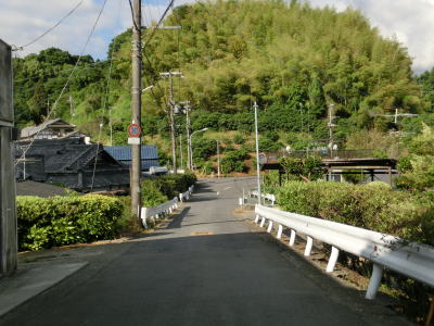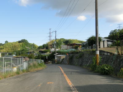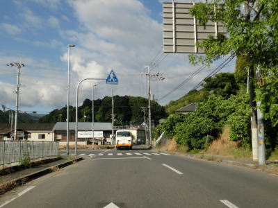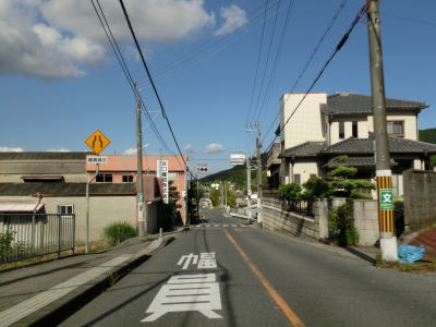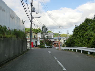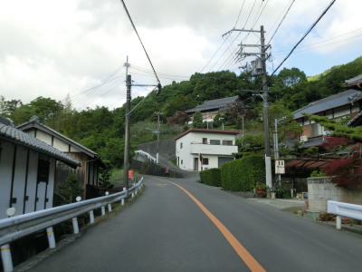 | 等高線に沿った勾配の緩やかな1.5車線幅道路を走る。センターラインの引かれた箇所もあるが、カーブひとつ分だけという短さである。家屋が途切れることなく続いているが、交通量は少ない。 | ||