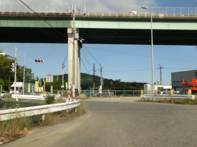 | 岸和田市に入って緩やかな勾配を下っているとR170外環の下をくぐり、左にカーブして外環と並走する。前方には外環の上を横切る高架道路が見えるが、これは阪和道の奈良池橋である。その橋の東で外環との交差点に至る。案内標識がなく何となく外環との交差点だと分かるが、現道のトレースは直進ではなく右折して外環と合流するというルートである。 | ||