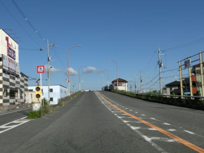 | 大野町交差点からも上り勾配が続いている。下り勾配になってから程なくして集落に差し掛かるとセンターラインがなくなり1.8車線幅と狭くなる。山の斜面の集落を走っているとさらに道幅が狭くなり1.5車線程度になる。 | ||