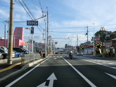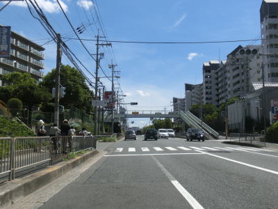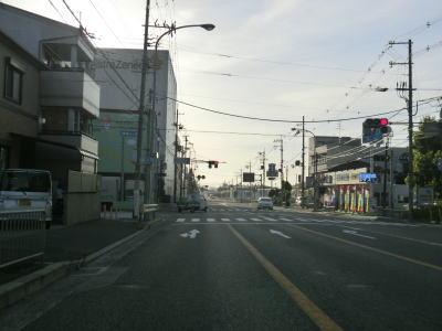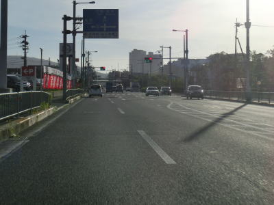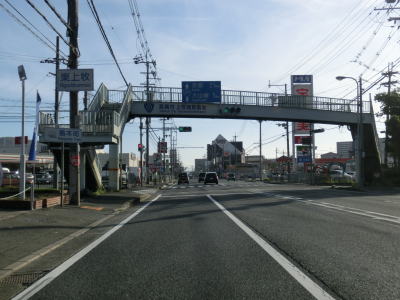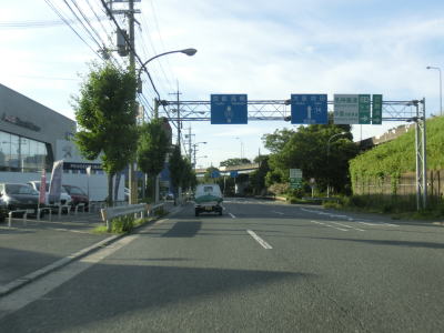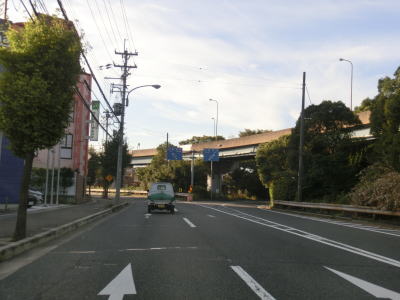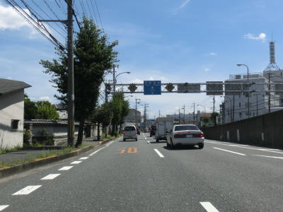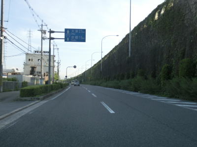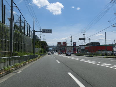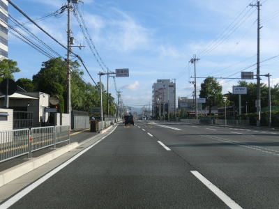 | 右側に大阪r14からの道路が合流して反対車線の高架道路が終わると4車線道路になる。その際に左側車線が減少するという警戒標識が設置されているが、実際には車線は減少しない。茨木川を渡り大阪r15・r46西河原西交差点を通過する。r15は西河原交差点付近こそ幹線道路然としているが、八尾市までの区間において一方通行あり商店街ありの険道で車両でのトレースは不可能である。r46は山岳険道であるが安威川ダム建設に伴う付け替えで随分走りやすい区間が増えている。 安威川を渡り上り勾配を走っていると西河原交差点や三島丘2交差点、三島丘西交差点を通過するが、右折車両が多い割に右折車線がないという厄介な交差点である。三島丘交差点で市境を越えて高槻市に入ってからも同じような状態が続いている。 |