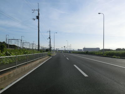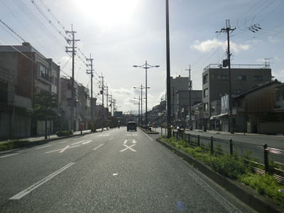 | 向日市に入ってすぐに京都外環状線を構成する京都r203との菱川・上植野交差点を通過する。さらに進むと東海道新幹線の高架下をくぐるが、市境標識は設置されてないものの高架から200m程の間は京都市伏見区を通っている。 新幹線の高架から程なくして分離していた南向き車線と合流して4車線道路に戻る。以降も沿線には工業は物流倉庫が目立ち一般家屋は少ない。そんな風景の中を走っていると京都市南区に入る。工場や物流倉庫が並ぶ中に商業施設が点在しているので観光地としての“京都らしさ”が感じられる場所ではない。 |
