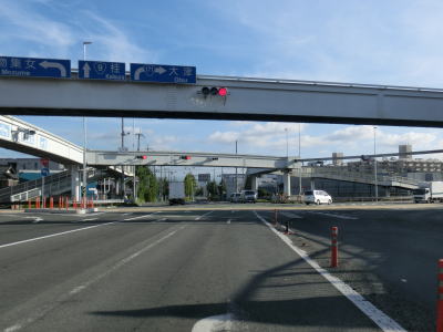 | カーディーラーが林立する4車線道路を走っていると名神の高架をくぐり、そのすぐ先で茨木ICが右側に分岐・合流する。インターの直後は大阪r14が右側に分岐している。インターとr14が連続で分岐しているうえに名神からの京都方面への合流車両もいるので、予期せぬ動きをする車がいるので事故が発生しやすい構造と言える。r14が分岐すると高架に沿って左にカーブする。その高架道路はR171の東向き車線である。 | ||