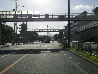 | 片側2車線の道路を走っていると葛野大路九条交差点から約1.9kmで起点のR1京阪国道口交差点に至る。終点の三宮東交差点はR2が東と南に屈曲していた交差点だったが、京阪国道口交差点もR1が東と南に屈曲している交差点である。ちなみに、No.93の写真の左前方に見えているのは東寺の五重塔であり、京都駅から2km弱の場所である。 | ||