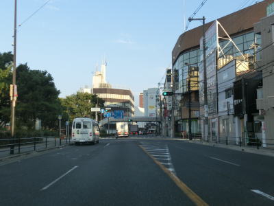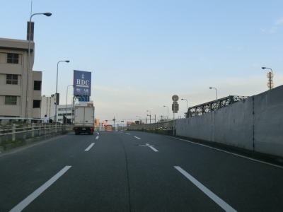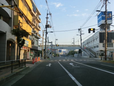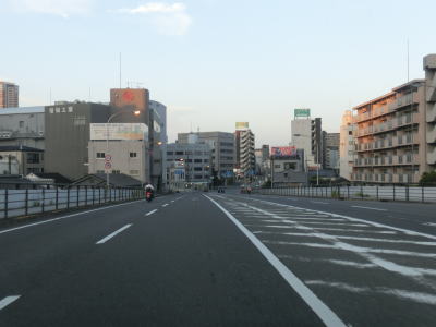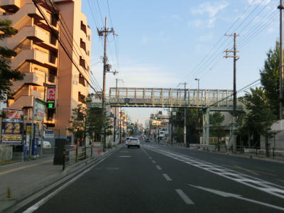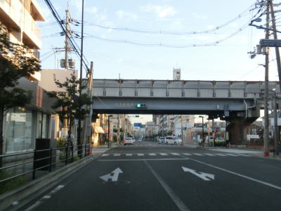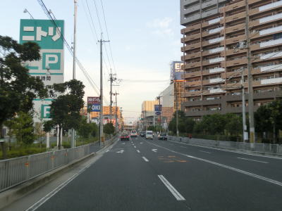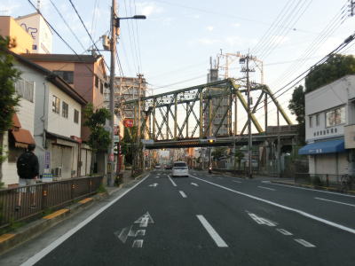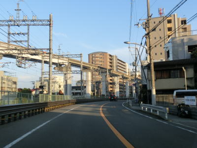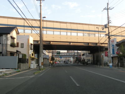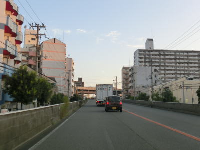 | 区民センター前交差点からは4車線道路を走るが、梅田貨物線を越える跨線橋は上下線どちらも左側車線が狭く、軽自動車ですらラインを踏まずに走るのは難しい。そのラインも消えかけている事もあって走りにくい。歩行者や軽車両は跨線橋の通行は禁止されており、平面の側道を通行しなければならない。跨線橋の頂点部分で高架の下をくぐるが、これは山陽新幹線である。なお、梅田貨物線を名乗っているものの一部の特急がこの線路を走っている。 跨線橋を過ぎると交通量の多い4車線道路を北上する。西側には阪急宝塚線が並走しているが間に建物があるため鉄道設備は見えない。三国駅の近くで緩やかな勾配を上った後に新三国橋で神崎川を渡る。神崎川は市境の河川であり、北側は豊中市である。 |