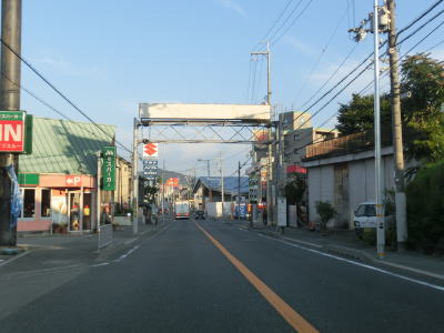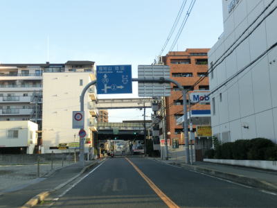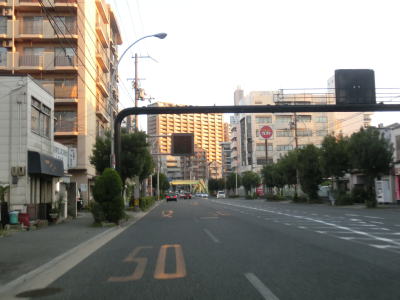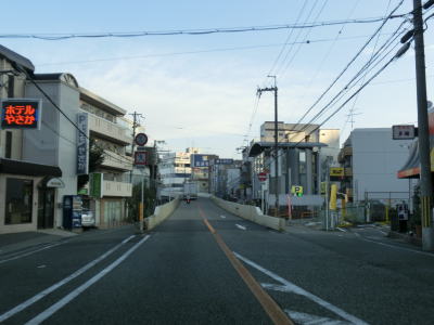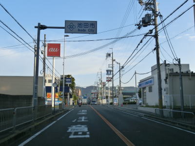 | 石橋阪大下交差点の直後に石橋跨線橋を通行するが、歩行者と軽車両に加えて16t超の車両も通行が禁止されている。特に16t超車両に対しては、数km手前から横断幕等で通行できない旨が警告されている。石橋跨線橋を上っていると左にカーブして阪急箕面線の線路を越えて下りに転ずる。平面道路も車両の通行は可能だが、1.0車線幅と非常に狭く歩行者・自転車が多いので非常に気を遣った走行になる。 石橋跨線橋から平面に戻ってすぐに箕面川を渡り、その先で高架道路の下をくぐる。高架道路はR171池田バイパスだが、側道部分は国道に指定されていないようで案内標識は設置されていない。その後は交通量の多い対面2車線道路を北西に進む。沿線には商業施設が点在しており昼間は流れが悪い事が多い区間である。 |