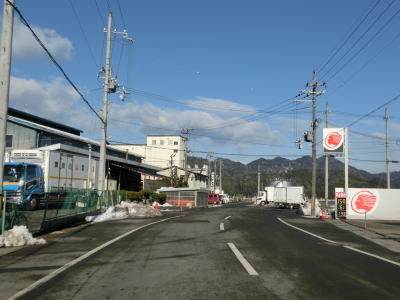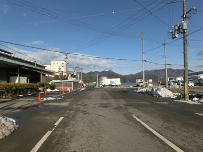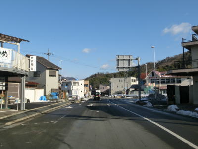 | 臨港道路との交差点のすぐ先で市道が接続している左急カーブを曲がる。正面の家屋の奥には伊佐津川が流れている。左カーブからも沿線に建っているのは普通の家屋が中心である。京都r565魚屋大森交差点を通過するが、このr565は舞鶴湾沿いを走る府道で狭路区間が多いにもかかわらず意外に交通量が多い。そのため、大手交差点〜魚屋大森交差点の間も意外に交通量が多い事がある。 魚屋大森交差点からは沿線の建物の密度が低くなり、家屋よりも水産関係や運送関係の建物が目立つようになる。歩道がなくなる代わりに広めの路側帯となっている対面2車線道路を走る。前方に山が見えているせいもあって港湾の近くを走っている印象は薄い。 |