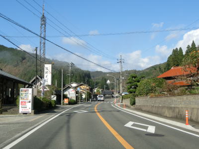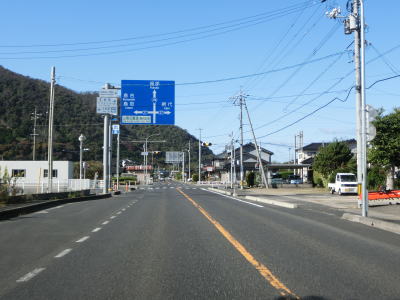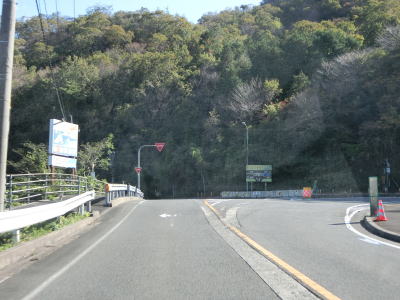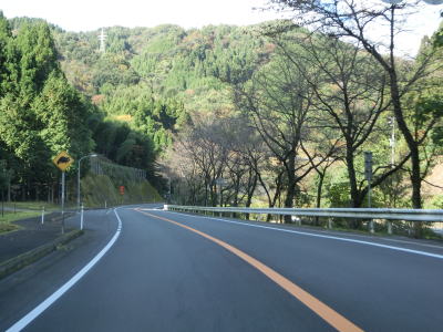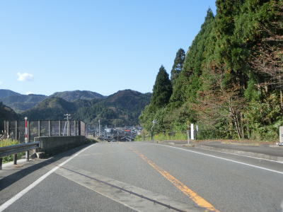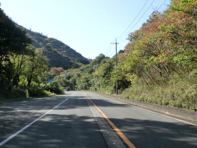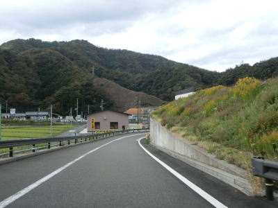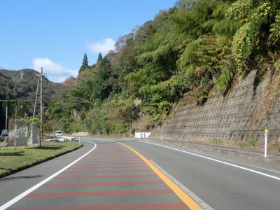 | 大浜川に沿った集落を通り抜けながら緩やかな勾配を上って行く。山間部の谷筋区間だが100番台国道とあってセンターライン付きの2車線道路と比較的整備されている。交通量は少ないが、通勤時間帯等で多少増えたとしても流れが悪くなる可能性は低い。江野集落を過ぎると集落が途切れ、程なくして江野トンネルをくぐって旧竹野町域に入る。 | ||