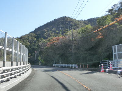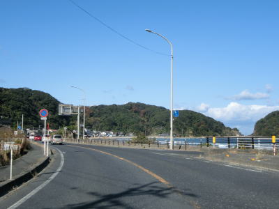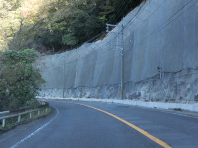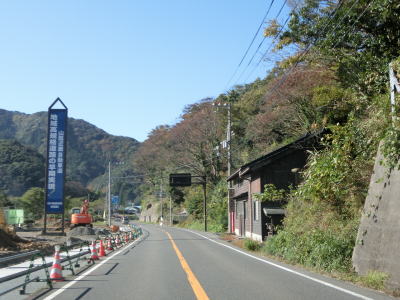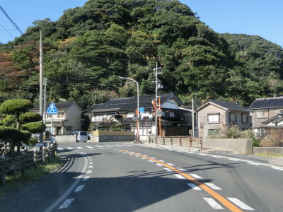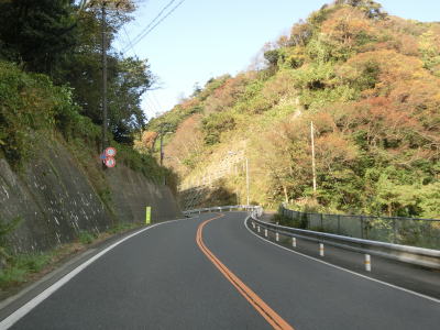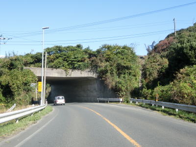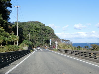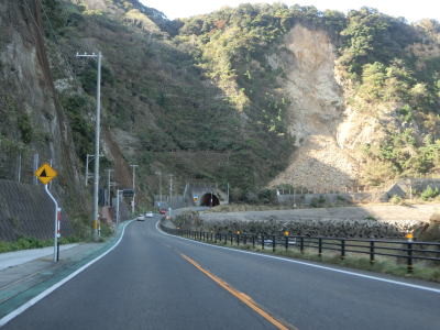 | 釜屋トンネルを出ると切り立った断崖が海に迫る場所を走る。前方に見える穴見トンネルの右側には崩落箇所が確認でき、崩れやすい場所である事が分かる。走行した日の半月後の11月22日に落石が発生して通行していた車が直撃を受けている。 穴見トンネルを出ると緩やかな勾配を上って海面との高低差が生じる。穴見橋を渡った先に穴見海岸展望所があるが、元々は狭い駐車帯だったものをごく最近整備したようである。穴見海岸展望所を過ぎると海岸線から少し離れた場所を走る。 |