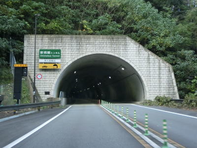 | 全長2984mの船越トンネルを出てノヲミ谷橋を渡った先で余部ICを通過する。余部ICはR178旧道の兵庫r4と接続しているが、r4に指定されているのは豊岡方面のみで新温泉方面はまだR178のままである。ただし、JR山陰本線の余部橋梁付近までの約1.1kmの区間だけであり、それより西は町道になっている。 余部ICを過ぎてすぐにあまるべトンネルをくぐが、その手前にはR178のおにぎりが設置されている。短い明かり区間の後に新桃観トンネルをくぐって新温泉町に入る。桃観トンネルを含む旧道は町道に降格しており、走行当時(2021年11月7日)は災害のため通行止であった。R178(=E9山陰近畿道)は無料で通行できるとは言え、自動車専用道路のため桃観トンネルもおそらくは復旧されると思われる。 |