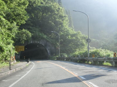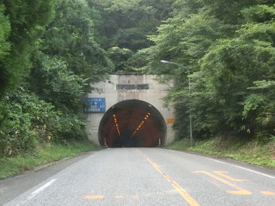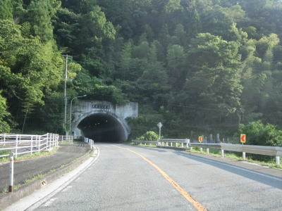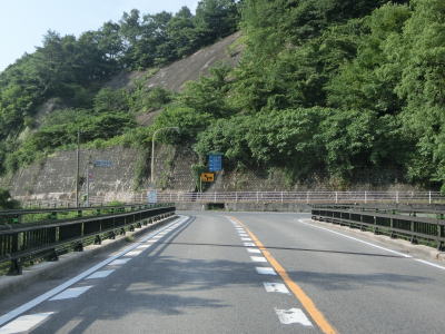 | 500m弱の登坂車線が終わった所で明地トンネルをくぐって鳥取県日野町に入る。トンネル手前の駐車スペースに旧道らしき道路が確認できるが、舗装されておらず通り抜けはまず不可能であろう事が分かる。また、明地トンネルは1970年代に供用されているが、その全長は1130mと結構な長さである。 | ||