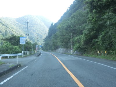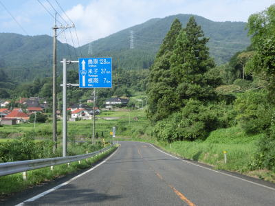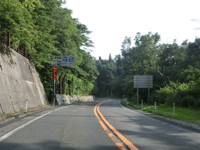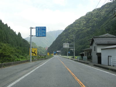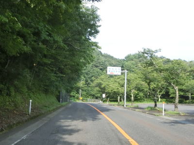 | 緩やかな上り勾配の2車線道路を走っていると正面に剣山と思われる山が見えるが、山頂の少し西に明地峠があり、その南には新見美しの森というキャンプ施設がある。そして、これまで流域を走ってきた高梁川の源流のひとつでもある。新見千屋温泉の前の右カーブを曲がった後に登坂車線が現れる。これまでの区間は勾配もカーブも比較的緩やかであったが、鳥取県側はそうでもないらしく「鳥取側 カーブ多し」という看板が設置されている。 | ||