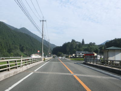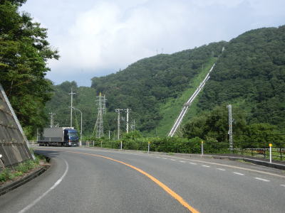 | 山間部ながら勾配は非常に緩やかな2車線道路を快走する。川沿いのためカーブは多いものの急カーブは少ない。JR伯備線の第四日野川橋梁と第五日野川橋梁の間は伯備線も右岸を通っており、その辺りの対岸に黒川発電所の送水管が見える。 | ||
