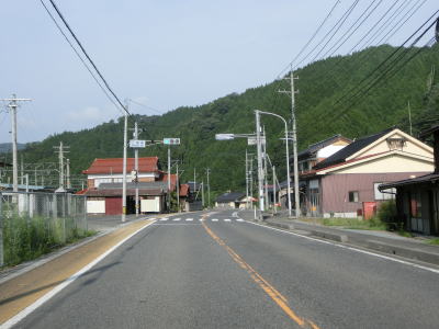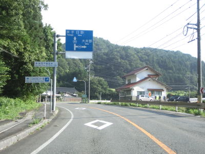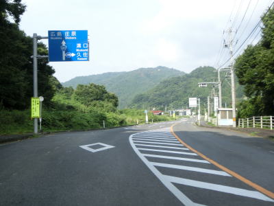 | 根雨上橋を渡って板井原川の左岸を走るが、勾配もカーブも少ない快走路である。右前方に家屋が密集している様子が見えるが、それが日野町の中心部である。高尾交差点から約1.1kmでR181・R183塔の峰交差点に至り、ここも左折する。案内標識には直進のR181に米子と松江が案内されている一方でR180には広島と庄原が案内されているので、その行き先に戸惑うかもしれない。広島と庄原は重複しているR183で行く事ができる場所である。 | ||