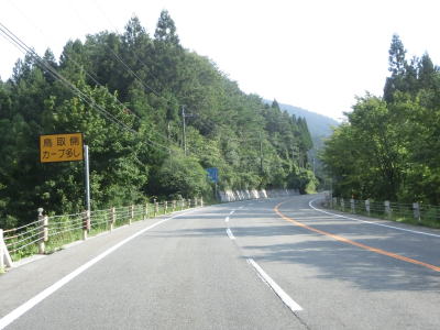 | 鳥取県側は岡山県に立てられていた看板通り、急カーブが多く勾配もややきつい。明地橋を渡った先で明地高原展望所とその駐車場を通過する。展望所からは大山を望む事ができる。展望所からもカーブの多い下り勾配の2車線道路が続いている。ヘアピンカーブもあるが2車線なので充分に減速すれば比較的容易に通過できる。 | ||