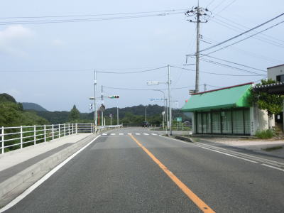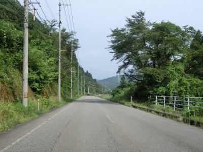 | 念佛橋と白山橋を渡って賀祥ダムの西を通り過ぎると下り勾配となる。法勝寺川を何度か渡りながら谷筋を走っていると、視界が開けて周辺に家屋と田畑が確認できるようになってと勾配は緩やかになる。 | ||