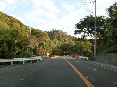 | 信号機も案内標識もない広島r462交差点の直後に三曲橋を渡る。r462は1.0車線狭路区間のある険道であり、案内標識が設置されていないのもそのせいかもしれない。三曲橋以降もカーブの多い状態が続いている。百谷川の左岸を走っているが、川との高低差があるため川面は見えず川に沿って走っているというイメージは感じられない。 | ||