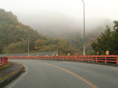 | 旧道の交差点を過ぎると沿線の家屋が途切れる。急カーブを示す警戒標識が立っているが、道路の線が円を描いておりループがある事が分かる。ループ部分のカーブが始まる手前に異常気象時通行規制区間の起点がある。起点付近には規制値を示した標識は立てられていないが、時間雨量40mm、連続雨量120mmを超えた場合に規制される。旧道のガードレールの下を左にカーブしていると油木大橋を通る。油木大橋自体も左にカーブしておりループを構成している橋と言える。 | ||