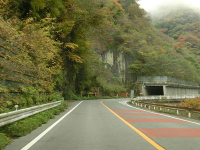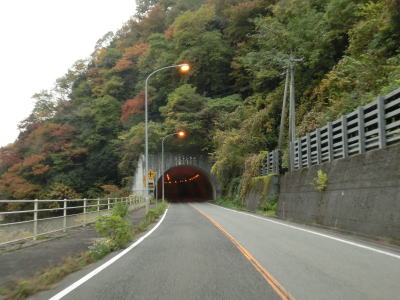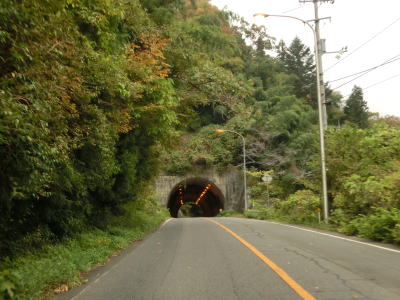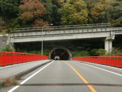 | 野田の丸集落に繋がる町道との交差点を過ぎると安全溝(グルーピング)が設置された区間を走る。4輪車では全く気にならないが、2輪車や自転車、特にタイヤ幅が細いものは気を遣うのかもしれない。谷筋を下っていると大渡橋を渡って田川瀬トンネルに入る。トンネル坑口の手前を横切る橋は町道である。 | ||