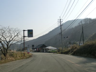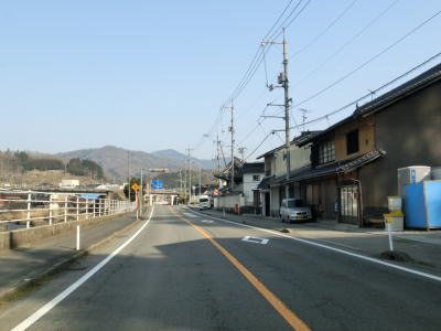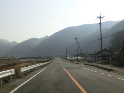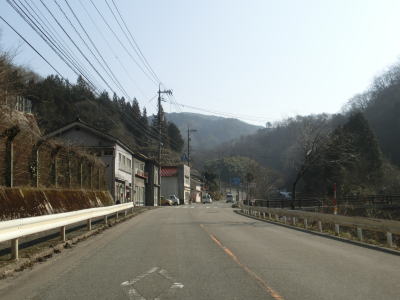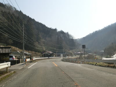 | 山岳区間と言っても開けた谷筋で勾配は緩やかである。センターライン付きの2車線道路なので走りにくい事はないが、急カーブが多く速度はあまり上がらない。路肩や日陰にはまだ雪が残っており、広島県と言えども北部山間部の積雪の多さが分かる。家屋が点在する明賀集落を走っていると落合発電所の真ん前を通過する。 | ||