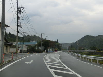 | 道の駅から程なくして左カーブに広島r119が交差している。小瀬川に沿ったカーブの多い上り勾配が続いている。山間部だが100番代の国道とあって2車線と整備されており、交通量が少ない事もあって決して走りにくい道路状況ではない。少し開けた所で飯山集落を通り抜ける。センターラインが消えかけているが2車線道路である。 | ||