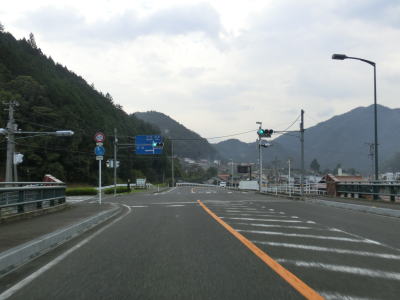 | 戸河内インター北交差点からも沿線の建物があるがこれまでに比べて車線幅に余裕があって走りやすい。右にカーブしている勾配を上ると上殿大橋を渡り、東詰で広島r304との交差点を左にカーブしながら通過する。太田川の右岸を走り、r304が分岐した直後に殿賀大橋で左岸に戻る。 | ||