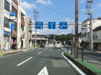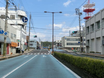 | 山陰本線のガードの直後の右急カーブを曲がると車線が増えて片側2車線になる。交差点の手前に青い塗装が施されているのは渋滞や横断者への注意を促すためだろうか。大橋で浜田川を渡った先でR9殿町交差点に至る。日本海側を東西に走る大幹線国道のR9との交差点なのでここが起点を思ってしまっても何ら不思議ではないが、R186の起点は江津市にあるため右折してR9と重複区間を走らなければならない。この先の区間はすべてR9に重複しているため一般的にはこの殿町交差点が起点と思わているだろう。 | ||