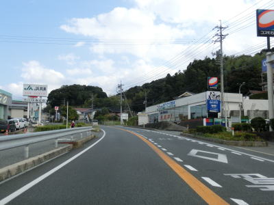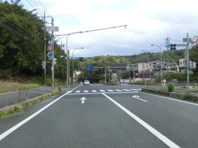 | 山陰道(R9浜田バイパス)との三宮ICを過ぎてしばらくは浜田川の左岸を走っている。左にカーブして浜田川から離れると市街地に差し掛かるため沿線の建物が多くなる。南側にそびえる山の裾を走っていると右の急カーブを曲がって島根r5との交差点に至る。R186は左折だが左折専用車線が設置されており国道が優先されている。 | ||