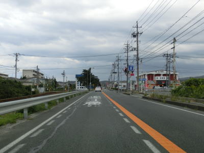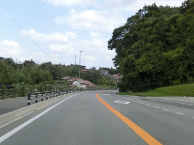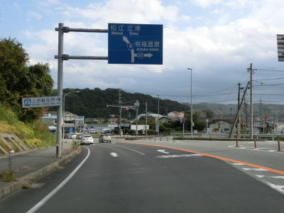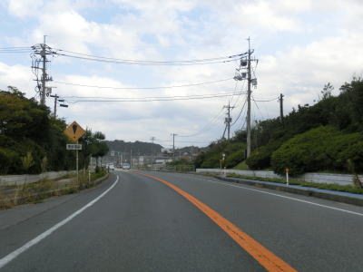 | 緩やかにアップダウンしている2車線道路を走る。概ね海に近い場所を走っているが、海が見える場所はない。海浜公園の一部でもある島根海洋館アクアスの前を通過し、緩やかな勾配を下っているとその他の危険を示す「!」の警告標識が立っている。補助標識には「飛砂滞砂」と書かれており砂浜が近い事が容易に想像がつく。 | ||