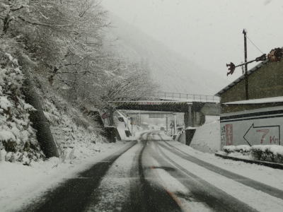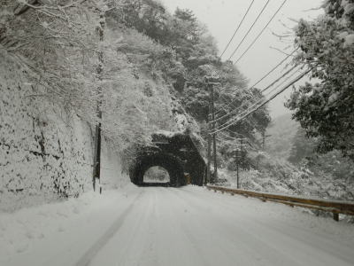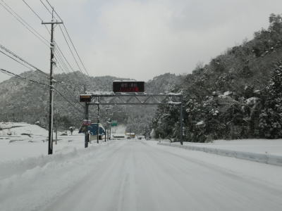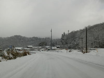 | 島根県側の勾配も緩やかで、積雪で見えないものの道幅は2車線なので走りやすい道路状況と言える。県境から最初の集落までの距離も近く、幸地川流域の開けた谷筋を下って行く。 | ||