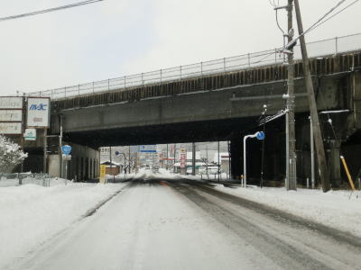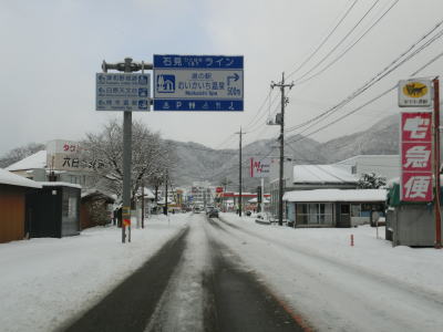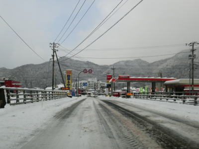 | 高津川の右岸を走っていると島根r42交差点を通過する。その後も高津川に沿っており、ほぼ平坦な2車線道路を淡々と走る。道路には轍部分を含めて積雪しているが、除雪もされているのでさほど走りにくさを感じない。 | ||