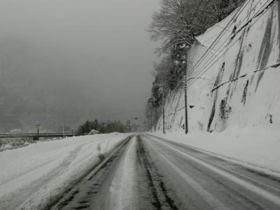 | 97.山が川に迫っている場所も2車線道路 | 98.気温は-3° | 99.落合集落 |