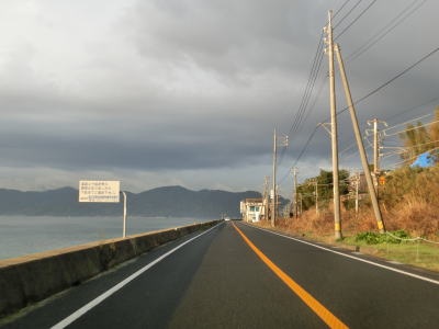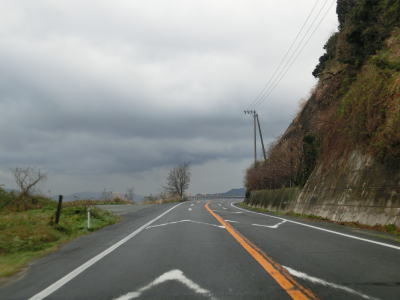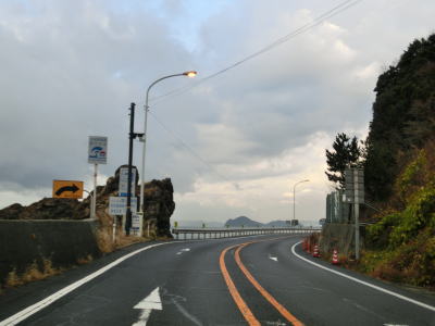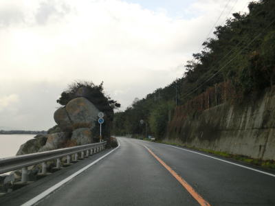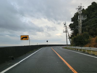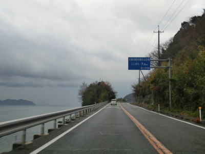 | 点在する集落を結びながらシーサイド国道を走る。交通量は少なく比較的速いペースで流れているが、回転半径100m程度のカーブをいくつも通過する事になる。また、海面との高低差が小さく波浪時には越波している可能性も考えられる。 | ||