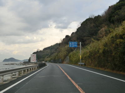 | 山口r163麻里府交差点を通過してから程なくして再び海岸線沿いを走るようになり、嘉永橋を渡った後に「大波の時の通行止」区間に入る。岩国市の大波の時の通行止区間に比べて標高が少し高いが海に近い事には変わりない。海沿いのカーブの多い2車線道路を淡々と走る。沿線には家屋はほとんどなく山が海に迫った場所である。 | ||