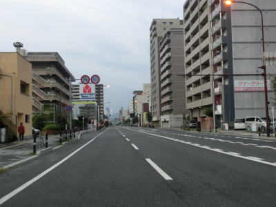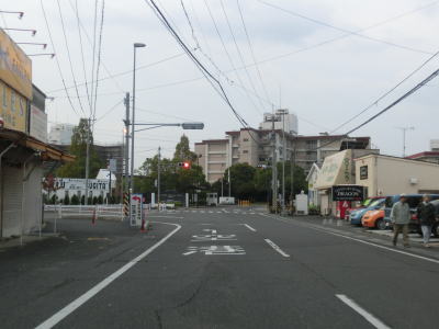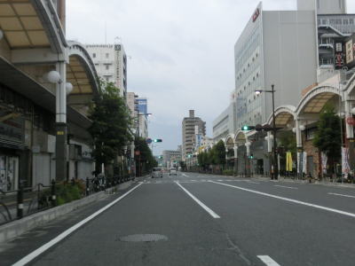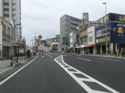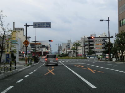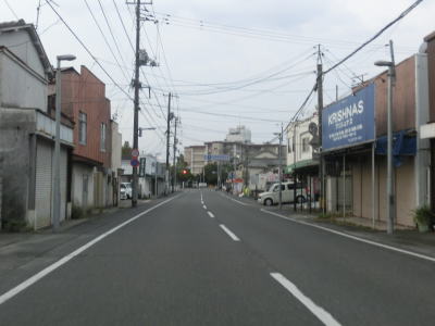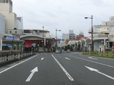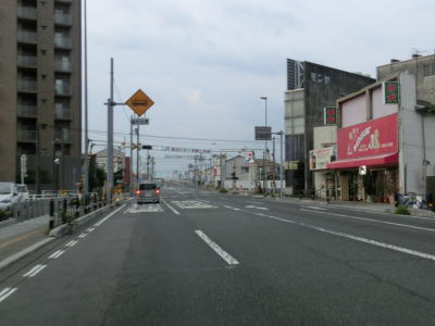 | ロータリーからはアーケード街を走っているが、車線は4車線のままである。約400m南の市道との三笠橋交差点で右側車線が右折車線となってしまい、交差点以降の南向き車線は1車線だけになってしまう。北向きは2車線のままである。この三笠交差点を右折して約1.8km進むとR188の岩国バイパスの既開通区間の北端に至る。 三笠橋交差点で車線が減少したが、100mも進まない距離で車線が増えて再び4車線道路になってJR岩徳線の踏切を通過する。踏切を通過してすぐに右側車線がなくなり、南向き車線は1車線になってしまう。 |