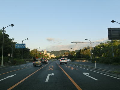 | 6.広島城南交差点を左折 | 7.片側2車線道路を西進 | 8.県立総合体育館前交差点を右折 |