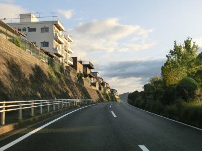 | 27.左端車線が減少 | 28.JR可部線をオーバーパス | 29.山の斜面に住宅が建っている |