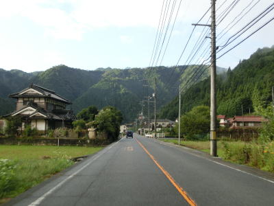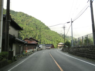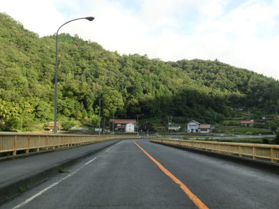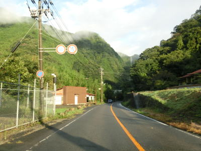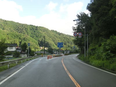 | 集落が途切れると山が川に迫った場所を通っており、勾配はほとんどないものの急カーブが多くなる。片側交互通行規制箇所があったが、これは台風18号によるものである。9月18日の走行時には通行止だったが、その日の夕方くらいには解消されていた。よって通行止区間の前後は9月22日に改めて走っている。 江河内集落に入ると少し開けた場所となり、周囲には多くの家屋が建っており町立病院もある。太田川の対岸には広島r304が通っているが、1.0車線幅区間のある狭路険道である。 |