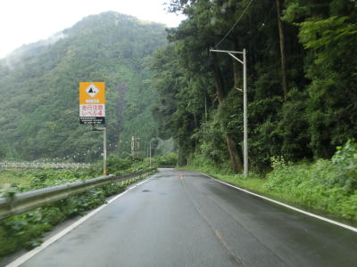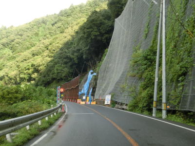| 相変わらず太田川の左岸を走っているが、これまでに比べて若干急なカーブが多くなる。光石集落と附地集落の間では落石防止ネットを設置する工事が行われていた。この場所はレベル4の走行注意区間の中である。対岸には広島r304がある。附地集落では右急カーブを曲がらなければならない。 | ||