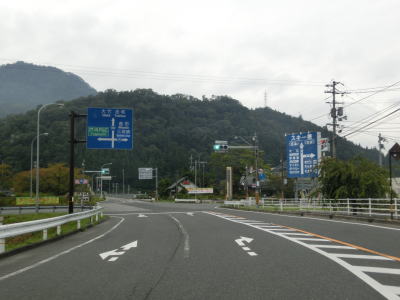 | 上殿大橋以降も走りやすい2車線道路が続いている。緩やかな左カーブを曲がっているとR186・R434戸河内IC入口交差点に至り、右折して益田・三段峡方面に進む。R434は直進してR186との重複区間が続く。左折は中国道の戸河内ICである。 | ||