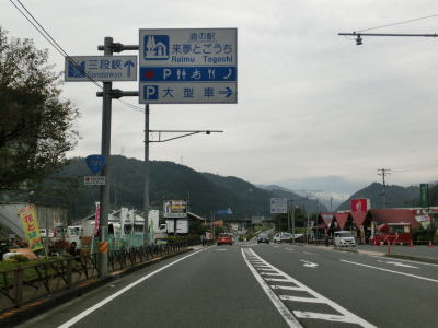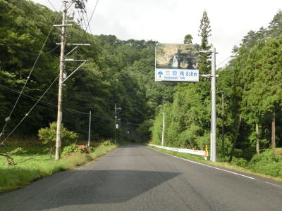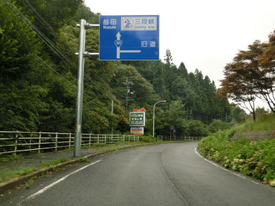 | 126.交通量は少ない | 127.旧道との交差点 | 128.「↑聖湖口三ツ滝 ←水梨口三段滝 深入山→」 |