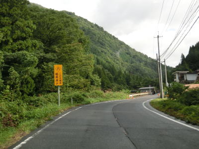 | 消えかけのセンターラインの2車線道路を走っていると板ヶ谷川に架かる橋を渡るが、その手前に幅員減少に注意を促す標識が立てられている。狭いのは橋上だけで、しかも糸王は2車線道路である。橋の両側に歩道が設置されているが、狭すぎて実用性は低そうである。板ヶ谷川の左岸に戻った所で板ヶ谷チェーン着脱場を通過する。その後は沿線の家屋がさらに少なくなり、緩やかながら長い上り勾配が続く。 | ||