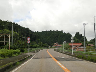 | 点在する家屋の前をいくつか通り過ぎながら2車線道路を下って行く。匹見川との高低差がなくなると勾配もだいぶ緩やかになる。元組集落付近では道路改良工事のため片側交互通行規制が敷かれている場所があった。 | ||