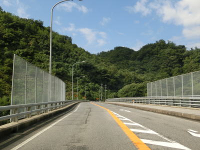 | 朝倉トンネルを出て少し走ると島根r54交差点を通過する。案内標識にはr54の行き先は何も表記されていないが、支柱に真砂・笹倉という地名標識が設置されている。r54交差点を過ぎてすぐに笹倉大橋を通過する。橋の一部に高いフェンスが設置されているが、その下には市道らしき道路が通っている。笹倉大橋からは上り勾配となり、いくつかの橋を通った後に左にカーブしている笹倉トンネルに入る。笹倉トンネルを出てすぐに久々茂トンネルに入る。 | ||