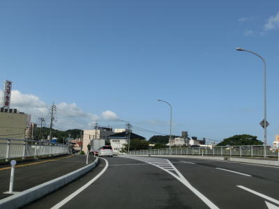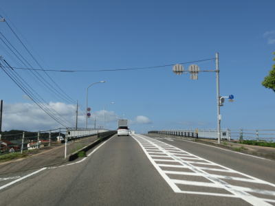 | 昭和跨線橋でJR山陰本線をオーバーパスして左カーブを曲がっていると雪舟新橋を渡る。雪舟新橋のすぐ先の島根r310交差点は右折しなければならない。直進する車両も多いので案内標識を確認していないとつられてしまいそうである。 | ||