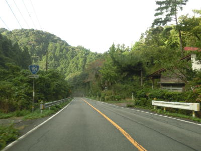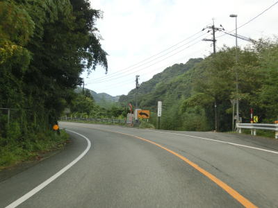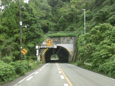 | 木間入口交差点を過ぎて少し走ると右にカーブして玉江隧道を通過する。隧道という名称にはなっているが、センターライン付きの2車線である。ただし、歩道は設置されておらずカーブしているため見通しが悪い。玉江隧道を出てすぐに駐車帯を通過するが、そこから1.4kmの区間は大雨の時の通行止区間に指定されている。山間部を走っているとは言え勾配とカーブは比較的緩やかなものが多く、交通量もさほど多くないため走りにくさはあまり感じない。 | ||