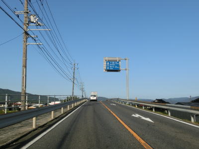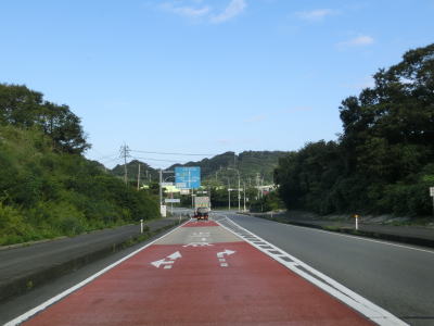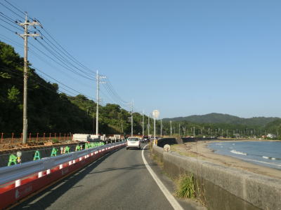 | S字状にカーブしてJR山陰本線と南北が入れ替わる辺りからは海が見えるようになる。跨線橋からの勾配を下って砂浜に近い状態になる。走行した日は歩道の設置工事が行われていたため片側交互通行規制が敷かれていた。長門市の市街地の電光掲示板に渋滞が発生する可能性があると表示されていたが、タイミングが良かったのか1回待つだけで通過する事ができた。その後海岸線から離れて内陸を走っているが、山陰本線との並走は続いている。 | ||