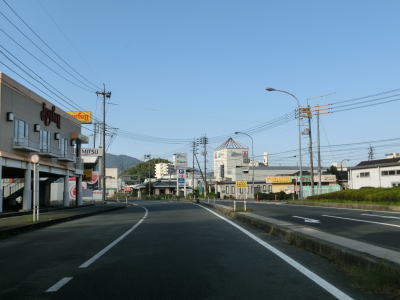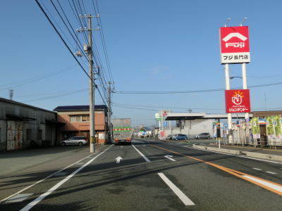 | 市道との緑ヶ丘交差点を過ぎると中央分離帯が現れ、その後すぐに車線が増えて片側2車線道路になる。市街地東部を直線道路を走っていると右にカーブした先でR316・山口r56正明市交差点を通過する。ここで左側車線がR316への左折専用車線になってしまう。 | ||