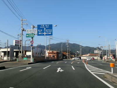 | 下り勾配から平坦になる所で山口r28宗頭交差点を通過する。案内標識ではT字路を右折するかのように描かれているが、実際は道なりに右へカーブする感じである。宗頭交差点からは平坦かつ直線的な2車線道路となる。交差点の直後こそは沿線の家屋が多いが、少し進むと水田の間を走っており見通しが良く走りやすい。そんな快走路を走っていると山口r36下中小野交差点を通過する。 | ||